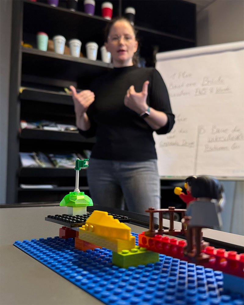 Du bekommst mehr als nur einen Workshop – Du bekommst einen klaren, umsetzbaren Fahrplan für Dein Thema. Nach einem unverbindlichen Erstgespräch konzipieren wir einen Workshop, der genau auf Deine Fragestellung und Dein Unternehmen zugeschnitten ist. Wir bereiten die Inhalte und Materialien vor und schaffen den passenden Rahmen – ob in unserer Agentur oder bei Dir vor Ort. Am Workshop-Tag selbst führen wir Dich und Dein Team mit erprobten Methoden wie „Lego® Serious Play®“ durch kreative, strategische Prozesse.